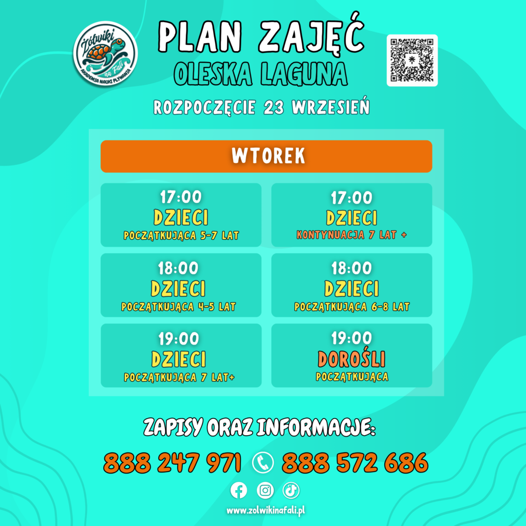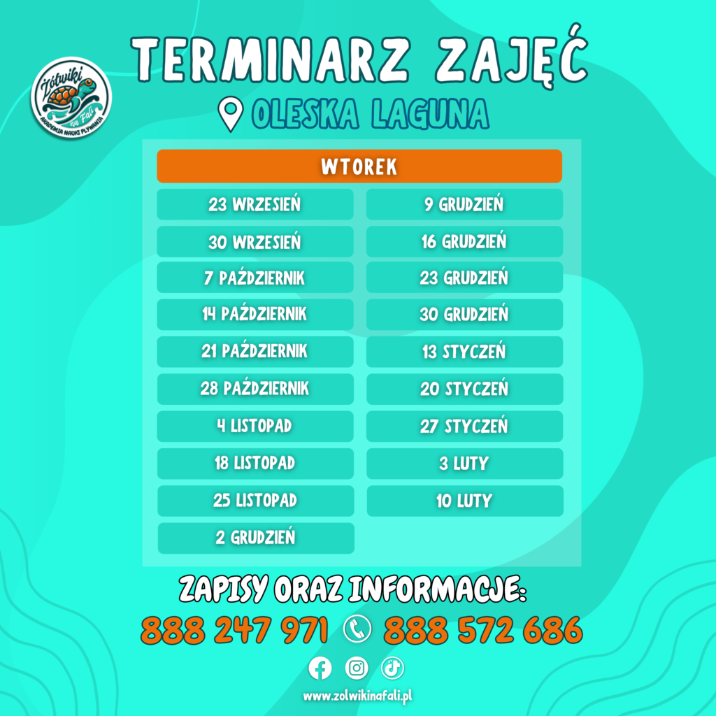 Z radością przedstawiamy harmonogram zajęć w pierwszym semestrze nauki pływania w lokalizacji Olesno – Oleska Laguna.